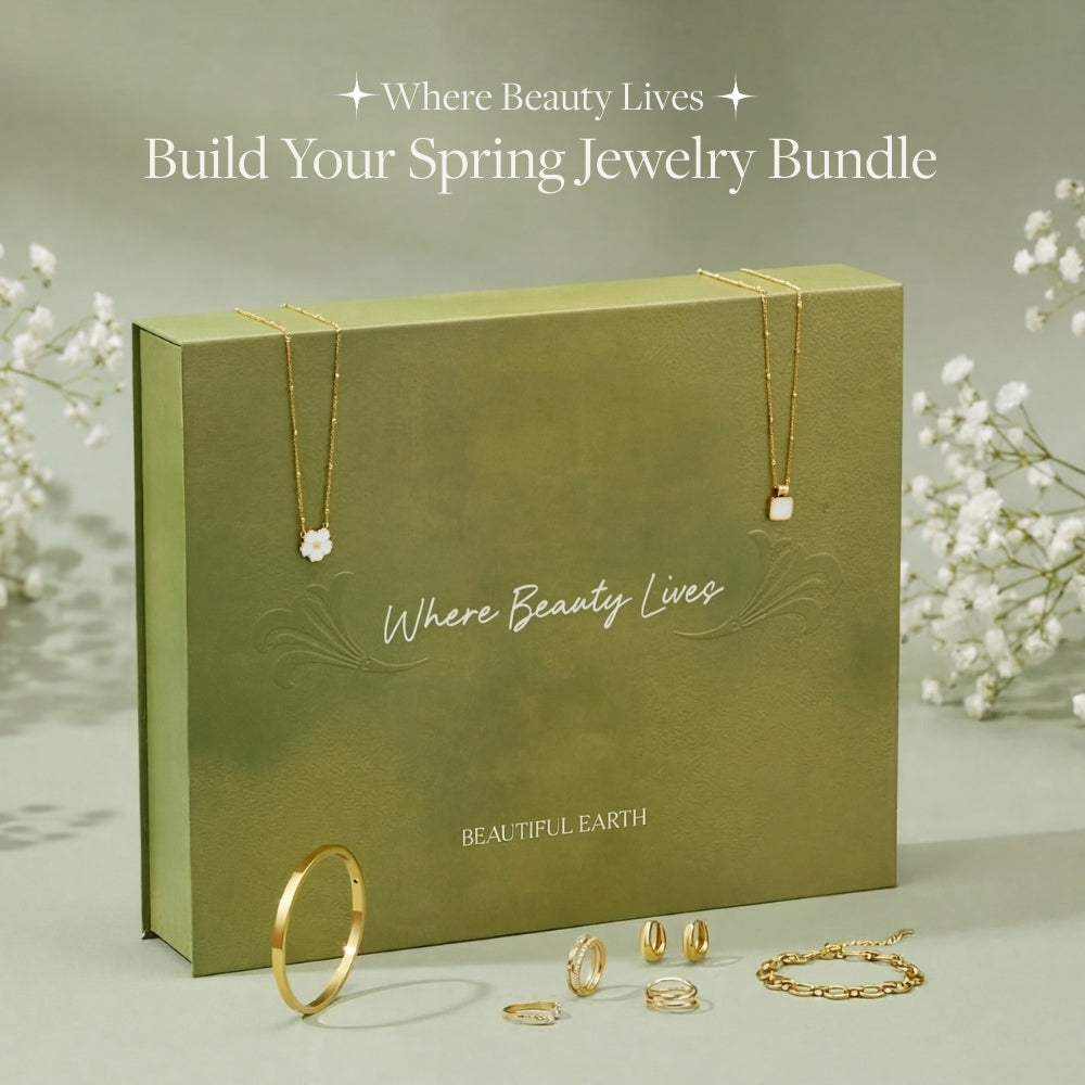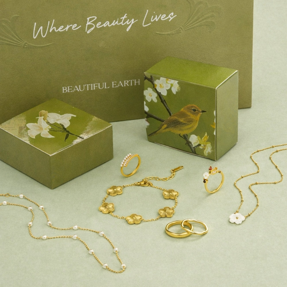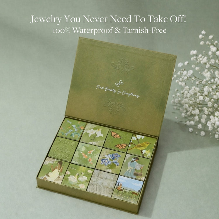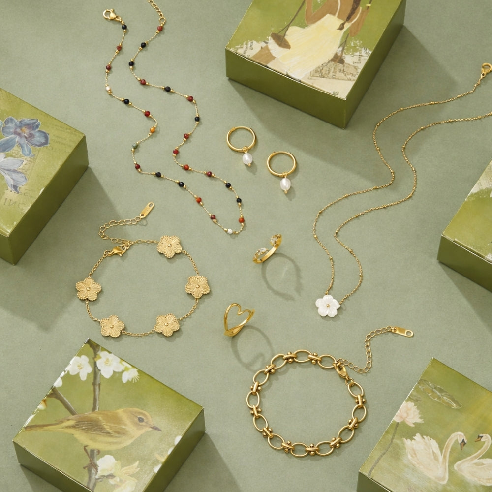 Waterproof & tarnish-free jewelry, limited edition spring packaging, and free shipping for all orders.